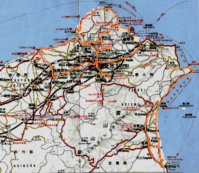 Cycling in northern Taiwan. Paths in orange are routes that I've biked before; some only once, some over a dozen times... NOTE: This image is interlaced, so have patience..it WILL become readable after awhile!